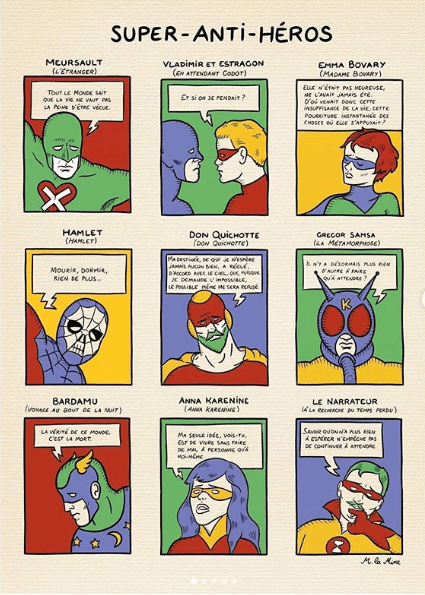 Difficile de choisir ! J’aime particulièrement le début de L’Indéprimeuse avec cette collection d’une trentaine de couvertures de livres canoniques aux titres complètement farfelus… J’aime aussi la collection des Super Héroïnes ! Je suis fan des femmes courageuses et des super héros Marvel, le combo était fatal 🙂