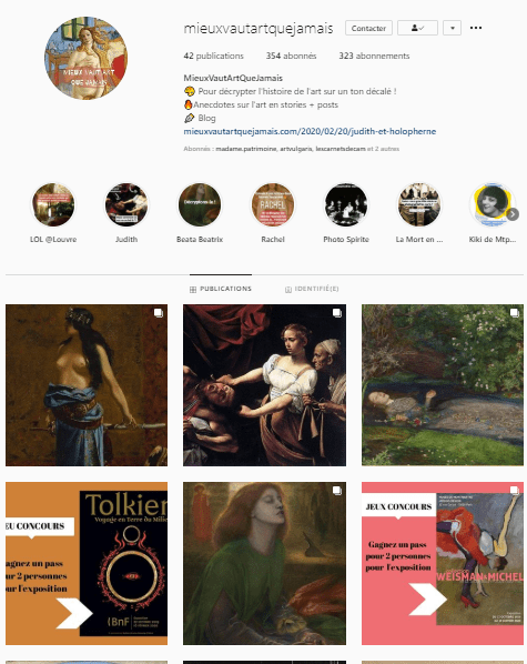 On commence avec un super compte pour apprendre l’histoire de l’art, tout en douceur et SURTOUT sur un jeu de mot que j’aimerai avoir trouvé moi-même (que voulez-vous, je bosse dans le marketing, on ne se refait pas). Je vous encourage vivement à aller le suivre et à échanger avec la personne qui gère ce compte et qui est simplement adorable. Mention coup de cœur sur les story reprenant les tableaux, mon péché mignon et un moment de bonne marrade. 10/10 !