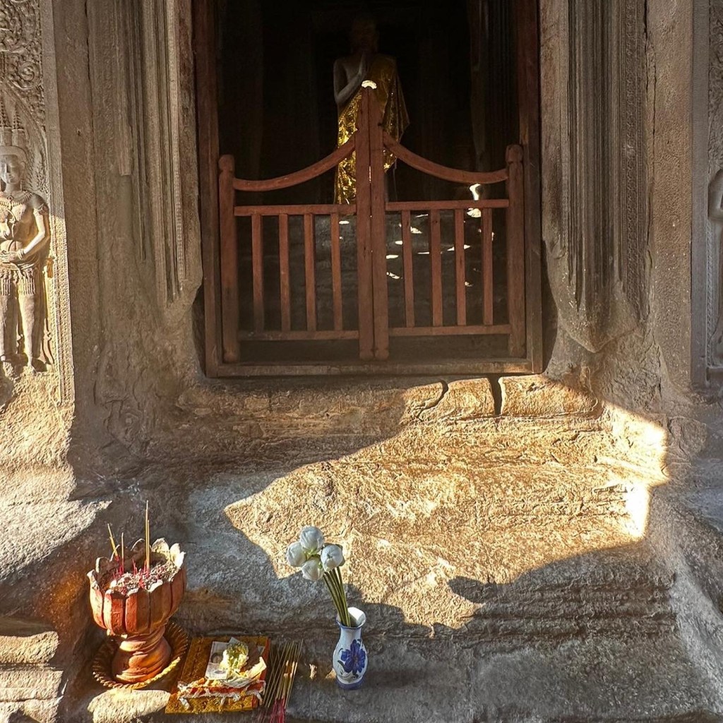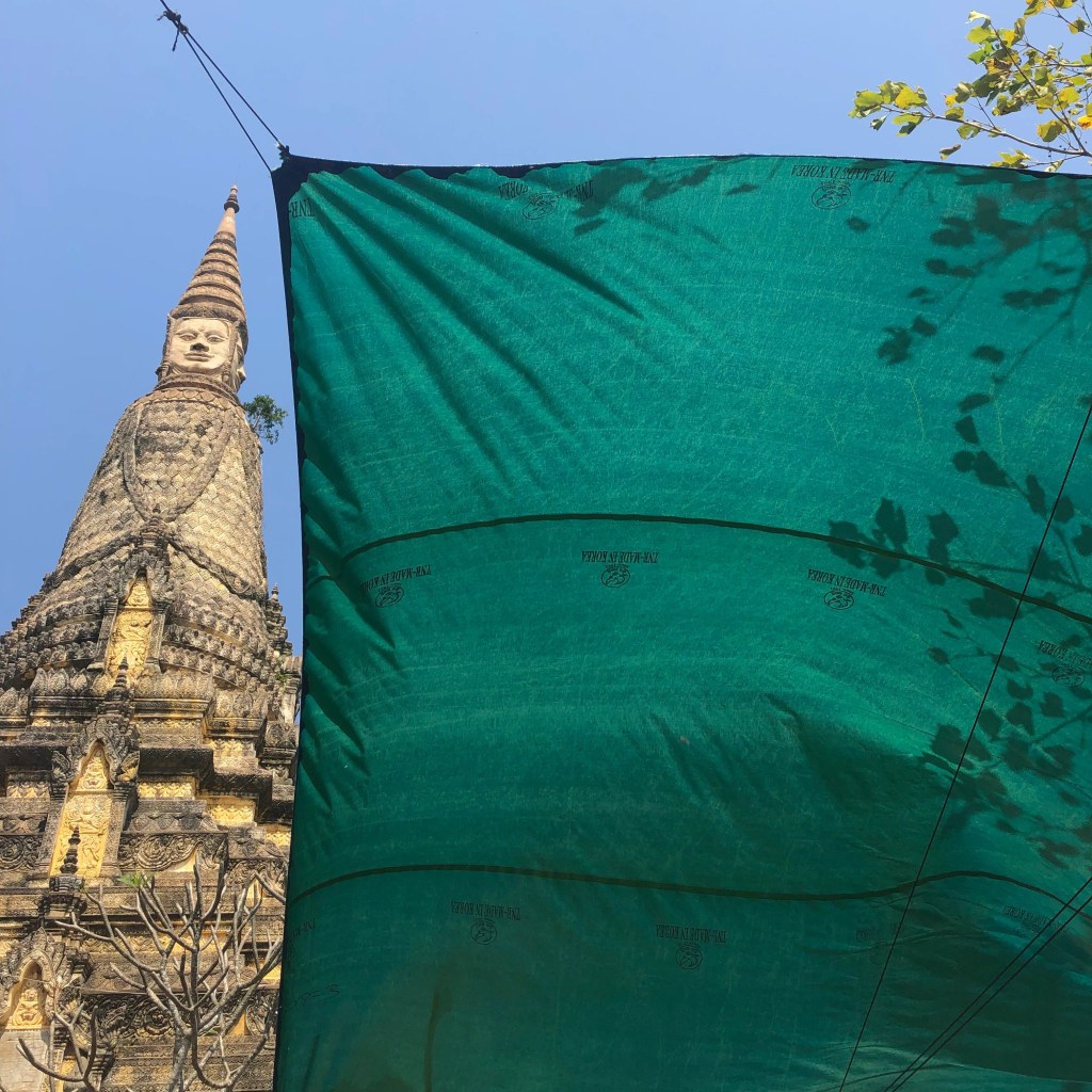 Jour 2. Départ à 8h en cortège de tuk-tuk. Palais Royal et pagode au sol en plaques d’argent. Je me fais bénir par un fil de laine rouge. Les fresques somptueuses racontent le Ramayana. Fleurs de frangipaniers dans les cheveux. Phnom Penh signifie « la colline de Penh ». Madame Penh érigea une colline pour le Buddha d’or et fonda ici la capitale. Les calaos veillent. Certains libèrent des cages remplies de moineaux pour expier leurs péchés. Visite du S-21, ancien lycée français transformé en camp d’emprisonnement et de torture par les khmers rouge. 20 000 victimes, 12 survivants. Le lieu est chargé d’une énergie lourde. Visite du marché central, nous achetons toutes des éventails parfumés pour alléger nos esprits.