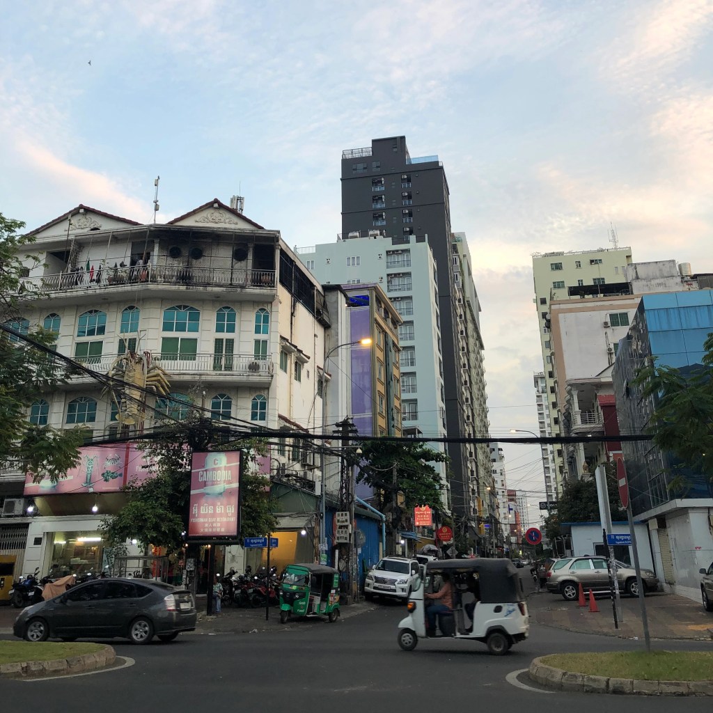 Jour 3. Visite d’une ancienne église XVIIIe, d’une pagode et d’une université chinoise reconverties en logements dédiés aux sino-khmers. Les bâtiments ont été totalement réinventés. Passionnant. Russian market : j’achète une main de Buddha en bronze et des pantalons à nouer. Plouf piscine et direction le Mékong pour une ballade en bateau-apéro-coucher-de-soleil. Face au fleuve, nous dînons tous ensemble au night market, assis par terre sur des nattes de plastique.