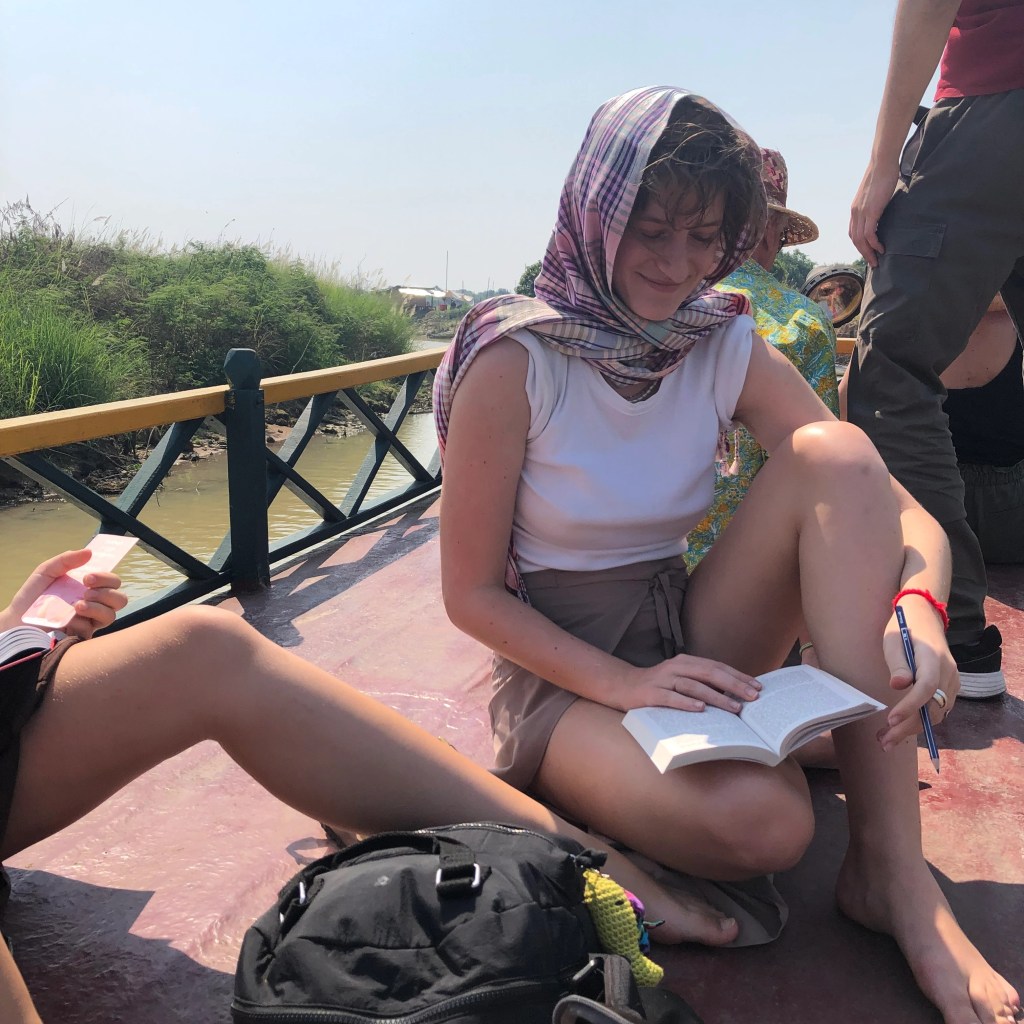 Jour 4. Journée départ de Phnom Penh pour Battambang. Montée des marches sur la colline d’Oudong vers le temple à relique de Buddha (une dent) – la première dent du Buddha que j’ai côtoyée était il y a 5 ans, au Sri Lanka. A la troisième on parlera de chasse au trésor. Visite d’une ferme de poterie d’argile. J’ai listé dans le livre Kampuchéa : maisons sur pilotis colorées ; autoroutes pour vaches ; rizières ; poissons séchés sur le bord de la route ; carrière de marbre ; maison du potier ; partout, le plastique ; meules de paille (m’évoquent celles de Monet) ; ananas au piment ; mangue verte ; terre rouge repeint les arbres ; champs de fleurs de lotus et coucher de soleil ; l’essentiel à pharmacie sur une aire de repos. Arrivés au Molopor, une jungle. On boit des cocktails bleus et on s’abrite sous les lianes en fumant des cigarettes.