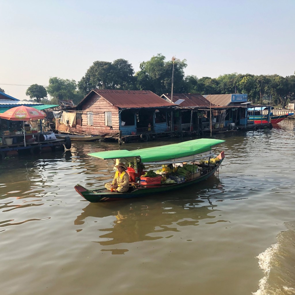 Jour 7. Départ pour Siem Rep. Nous partons tous en bateau, voguons sur le Sangker. Le voyage prendra sûrement la journée. Le fleuve est très bas en période sèche et certains passages sont rudes. Les enfants nous saluent sur la rive. Nous croisons des maisons-bateau, des parcs à crocodiles, survolons régulièrement des pêcheurs à l’ouvrage. Villes flottantes. L’apaisement de l’eau qui scintille de diamants sur le Tonlé-Sap, plus grand lac d’Asie. Visite d’une pagode, probablement flottante elle aussi quand vient la mousson. Les paysages de cette journée resterons gravés en moi, avec ses heures chaudes sur le toit de notre embarcation, les bières Angkor fraîches, les peaux abritées sous les krama, l’air poisseux de ces mondes aquatiques et la beauté de ce pays.