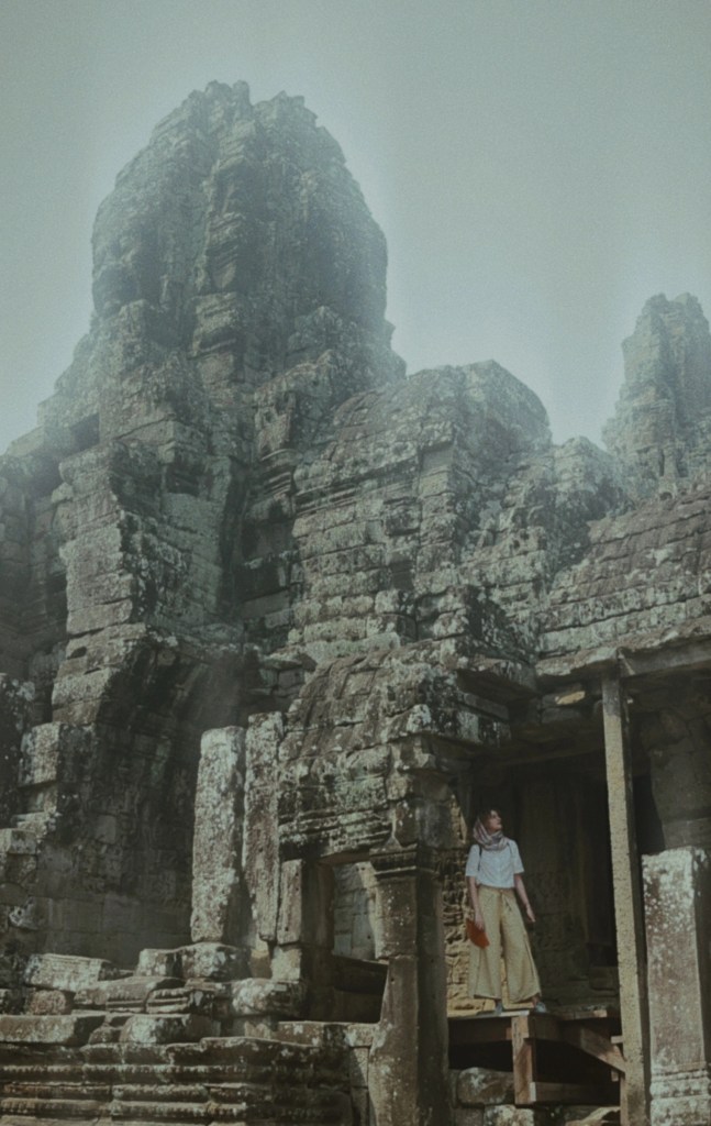 Jour 8. Angkor. Départ en cortège de tuk-tuk. Le matin, visite des temples de Bayon, du Palais Royal et de Baphûon, duquel émerge la tête d’un gigantesque Buddha couché. Terrasses aux éléphant et du roi lépreux. Prochaine étape : Ta Prohm, où les racines de figuiers étrangleurs et de fromagers étouffent progressivement les pierres infiltrées. Dans la lente agonie du lieu, les arbres sont les bourreaux autant que les sauveurs. Le combat du grès et de l’écorce d’argent se maintient dans le silence de la jungle. Angkor Wat est inondé de lumière dorée. J’ai prié Buddha en son sommet, brûlant un encens trouvé sur le sol de Bayon plus tôt ce matin. Le soir, nouveau spectacle de cirque – les acrobates accomplis de Phare jouent toutes les semaines à Siem Rep – les artistes célèbrent l’anniversaire de F. à la fin du show. Nous lâchons nos éventails anti-moustique aux couleurs vives pour un tonnerre d’applaudissements. Plus tard, sortie tous ensemble sur Pub Street, on dîne deux girafes de bière locale.