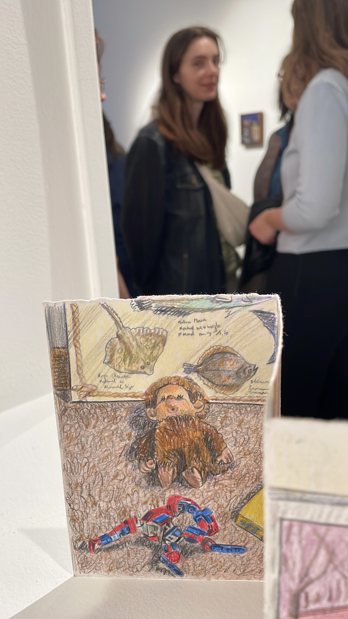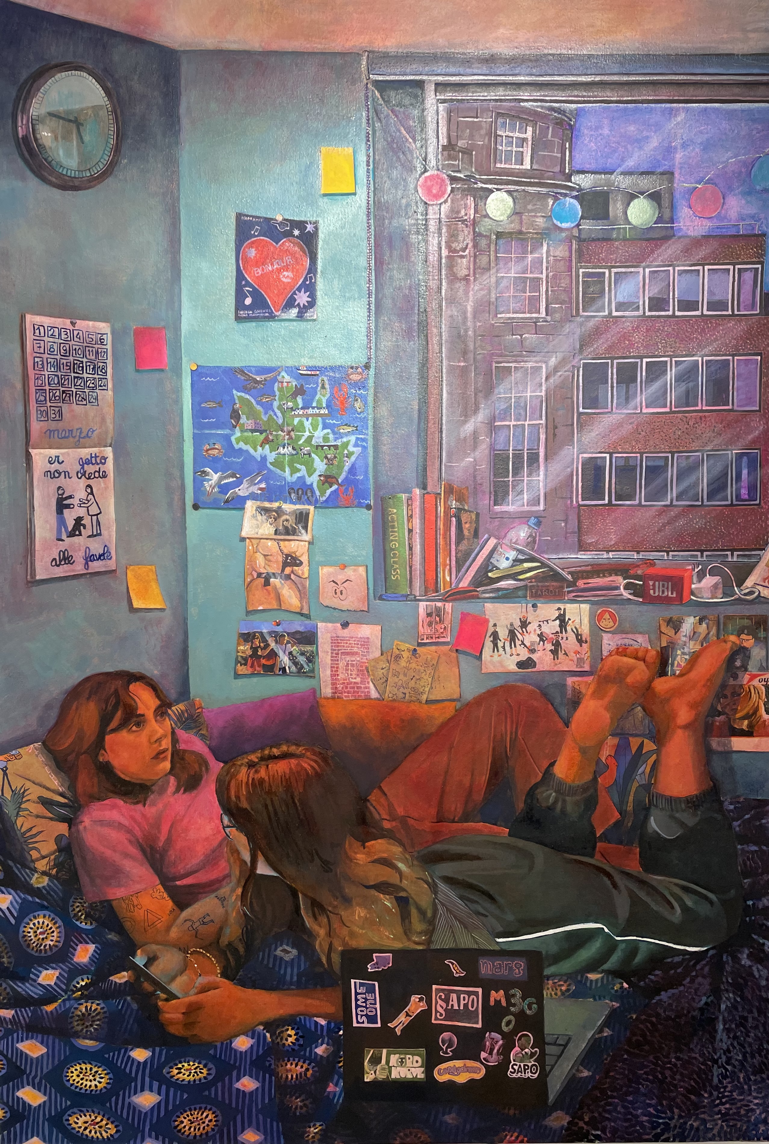 Il est bientôt 19 heures et il fait toujours beau, je troque les sabots pour les Converse à flammes et ressort une dernière fois voir les copains autour des toiles de Louise Janet. Effervescence parfaite pour finir une journée de printemps dans les scènes de vie dessinées et peintes, regorgeant de détails, au point qu’il suffirait d’ouvrir la fenêtre et d’y plonger. Je m’invente ses personnages, leurs conversations autant que les raisons de leur silence. Décidément, les sujets qui nous habitent ne cessent de se tisser entre eux.