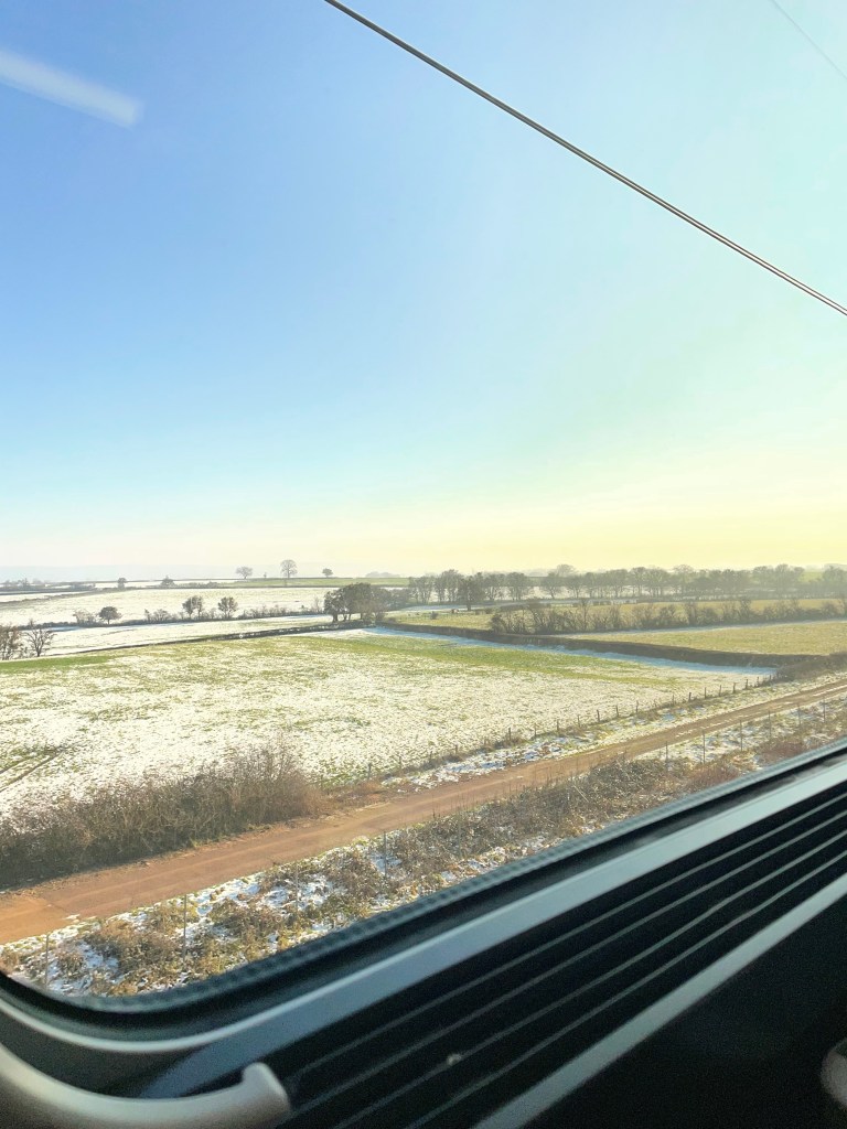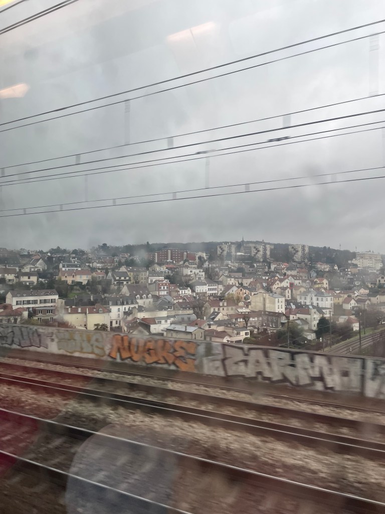 Le mec assit derrière moi ne parle que de son ex-femme à sa compagne de voyage. C’est une prise d’otages. Un couple de soixantenaires parlent de capotes et de l’Autriche. Un autre couple essaye de ne pas épingler leurs deux enfants. Le père leur prépare des tranches de pain de mie complet avec du fromage à tartiner. La campagne est plongée dans la brume, recouverte d’une neige poudreuse.