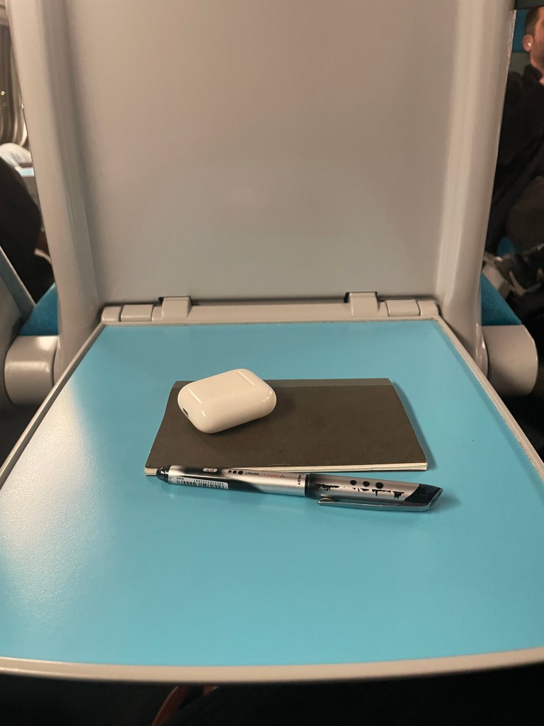 Karen Blixen décrit sa ferme au Kenya tandis que nous avançons au milieu des champs cultivés de la campagne. L’homme assit à côté de moi s’appelle Alessandro. Il dort pendant tout le trajet, son visage dissimulé sous sa casquette. Il est brun et barbu, ses sourcils sont sombres et épais. Il porte des vêtements qui lui donnent une apparence tendre et douce. Un pantalon en velours côtelé couleur sable mouillé et un pull bleu marine tricoté. L’idée de m’endormir sur son épaule me traverse l’esprit. Il n’a rien d’autre sur sa table que sa paire de lunettes de vue et son téléphone. Il ne s’en sert qu’une fois, pour géolocaliser son emplacement. Sur ma table, il y a :
