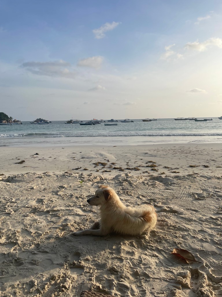 Les jours qui suivent ont le goût des fruits frais, de la Seabrew (bière locale) et de la sauce créole sur les poissons grillés. Nous nous levons à 6h tous les matins pour nous baigner avec les premiers rayons du soleil, déjà radiant. L’eau a la couleur du lait d’ânesse et nous devons prendre garde à ne pas marcher sur les petites raies qui ondulent en quête de leur repas. Entre nage, lecture et tartinade de crème solaire, je longe le ruban. Les hommes viennent me voir, me saluent poliment et me demandent si je suis seule. Ils ont tous un bateau, il suffirait de choisir. La journée, ils partent et reviennent, chargés de poissons qu’ils découpent et nettoient sur le sable pour lever les filets, entourés de chiens errants qui veillent et parfois demandent quelques caresses. Quand l’un des hommes arrive, ils le reconnaissent et lui aboient dessus. Le pêcheur montre les dents et brandit une poignée d’algues dans leur direction en hurlant « You want some more ? You want some more ? » et les chiens couinant reculent d’un pas. Le soleil couchant est rose, la mer mauve. Le soir, les crabes violonistes sortent de leur trou pour nous divertir au dîner.