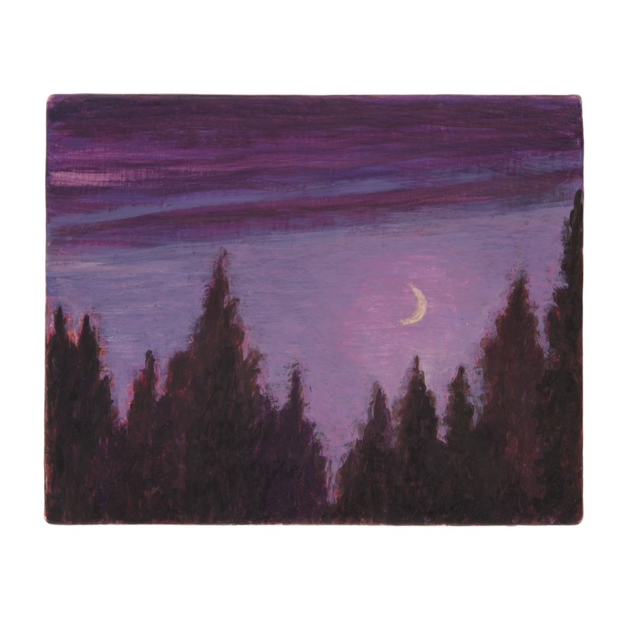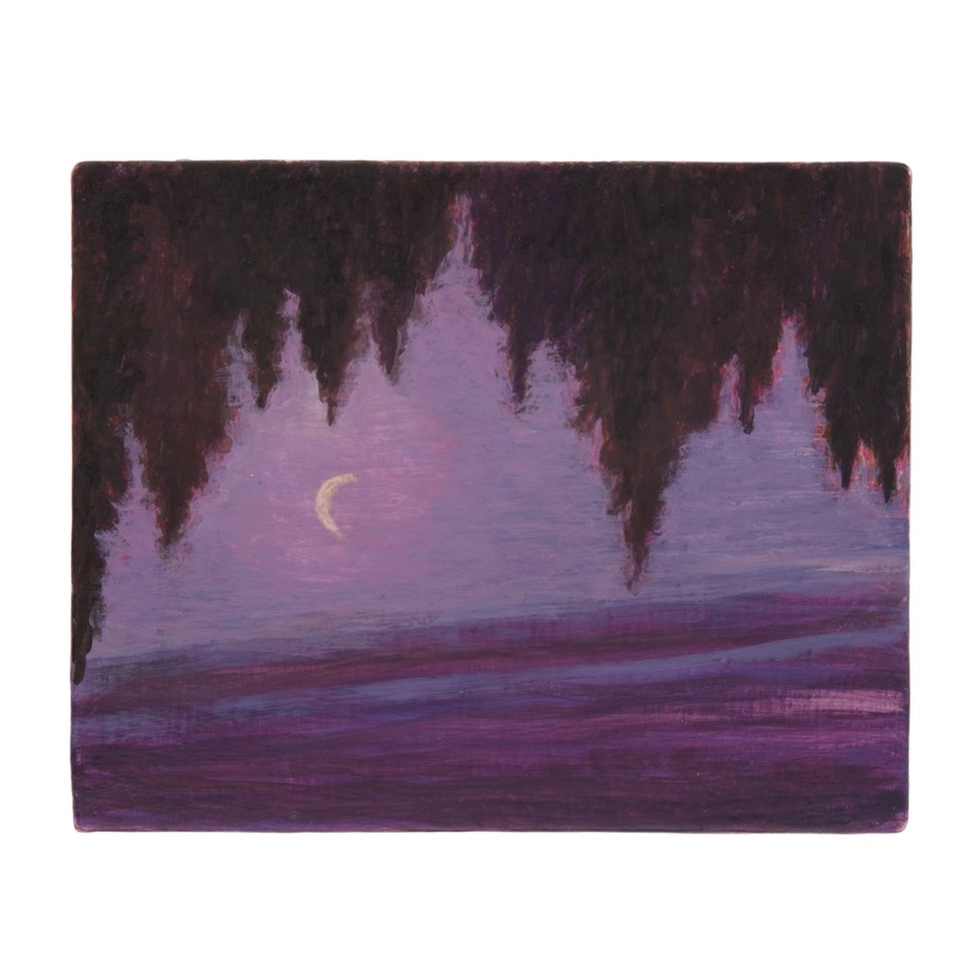 S’exposer est un risque. Le mot « Exposer » lui-même, peut se définir par « disposer de manière à soumettre à l’action de ». Laisser entrer la lumière, se livrer, créer l’action de, ce « de », le précipice causé par l’autre. Cette semaine j’ai eu le privilège de participer à l’accrochage d’une exposition, entourée du regard aiguisé, passionné, d’une amie galeriste, et des mains douces, méticuleuses, d’un jeune peintre en renfort. À mesure que se constituait la fresque, que quelques clous perdaient leur tête, les tableaux de vies nocturnes, transcendés par des lunes étincelantes, apposaient un à un sur les murs blancs le silence, le recueillement, si propres à l’arrivée de l’hiver. Oublié, le fond tumultueux de Paris, pluvieux, embrasé. Je ne suis pas critique, pourtant j’ai aussi écrit le texte de cet évènement, et comme dirait Joyce Carol Oates, l’écrivain ne pouvant se retenir de rivaliser en lisant d’autres oeuvres trouve une telle paix à se plonger dans la peinture. Durant le vernissage, le lendemain, fourmillant d’idées et d’échanges, les visiteurs me pointaient souvent du doigt la même œuvre, un crépuscule violacé, qui depuis la veille me retournait sans cesse. Retourné, c’est le mot, car dans les arbres dressés en paravent de nuages vaporeux, prêts à laisser leur place à l’obscurité, je voyais, inversée, une mer calme sur laquelle tomberaient les branches d’un saule. Ça m’a rappelé que petite, j’ai grandi en regardant ma grand-mère peindre dans son atelier. Elle me disait sans cesse qu’une œuvre pouvait se lire dans tous les sens. À l’endroit, à l’envers, sa fenêtre sur le monde échappait à la gravité, traduisant ainsi notre intériorité. La mienne est peut-être à l’envers en ce moment, désireuse de calme plat, je l’ignorais avant de la ressentir, de la comprendre, dans le travail d’Heidrun Rathgeb.