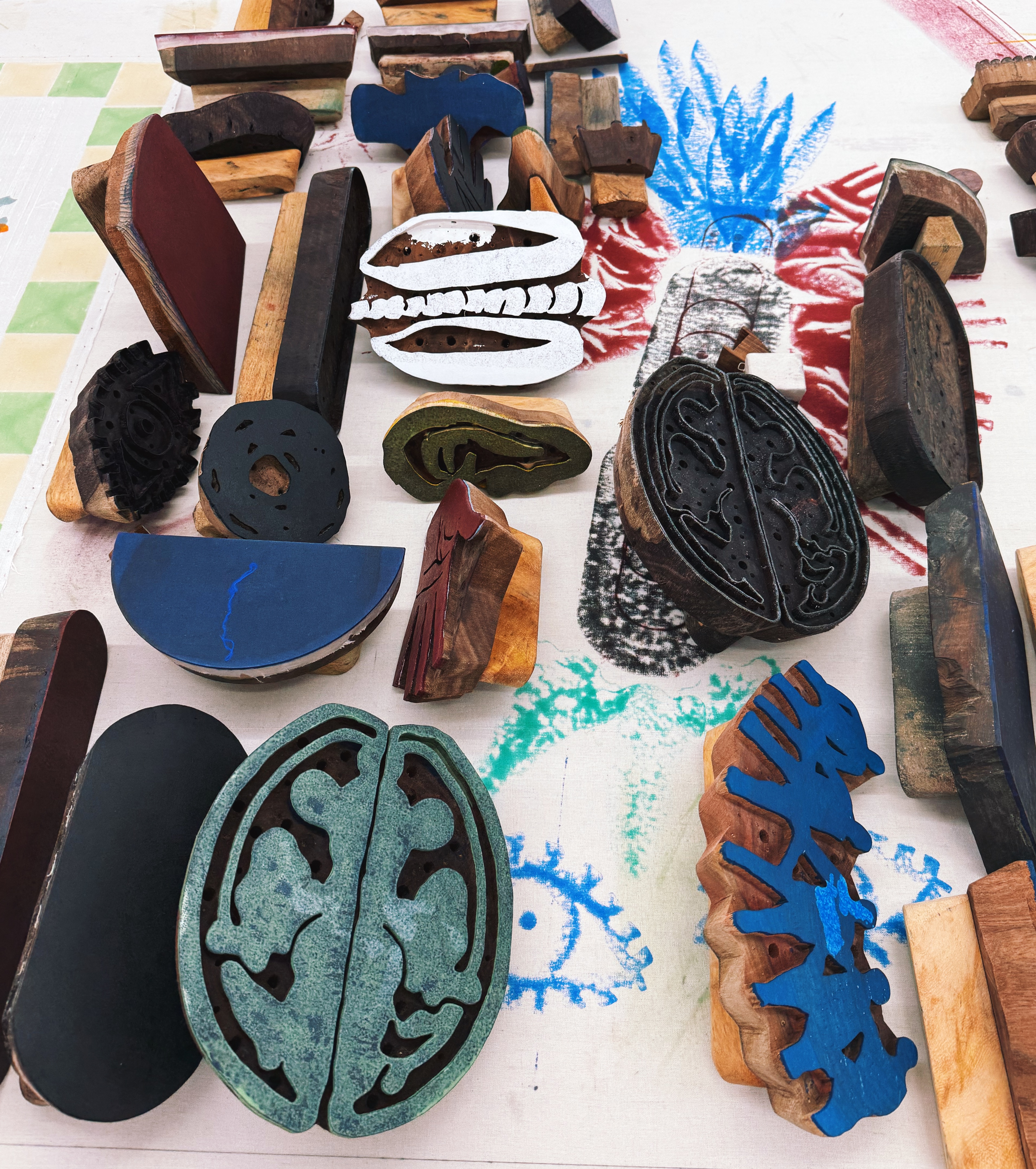 La seconde partie de la résidence qui se situe à Jaipur porte sur les block-prints, une technique d’impression par tampons réalisés à partir de blocs de bois sculptés. Ce procédé-là est un des plus anciens de l’Inde, autrefois utilisé à destination de personnalités royales, au moyen de pigments imprimés. Le dessin réalisé est collé sur une plaque de bois taillé, c’est le block. Le block-printeur le trempe dans l’encre, le pose sur le tissus, et tape sur le côté de sa main. Tremper, poser, taper, crée une musique très rythmée, très belle. Pour mes oeuvres, j’ai fait fabriquer 14 blocks représentant des parties du corps (des nez, des bouches, des oreilles), mélangés à des blocks d’archives du Jaipur Centre for Art. Comme à la manière des ex-voto que l’on retrouve en Grèce dans les chapelles, je m’en sers pour créer des personnages inspirés des formes physiques que j’ai pu voir, d’autres rituels.