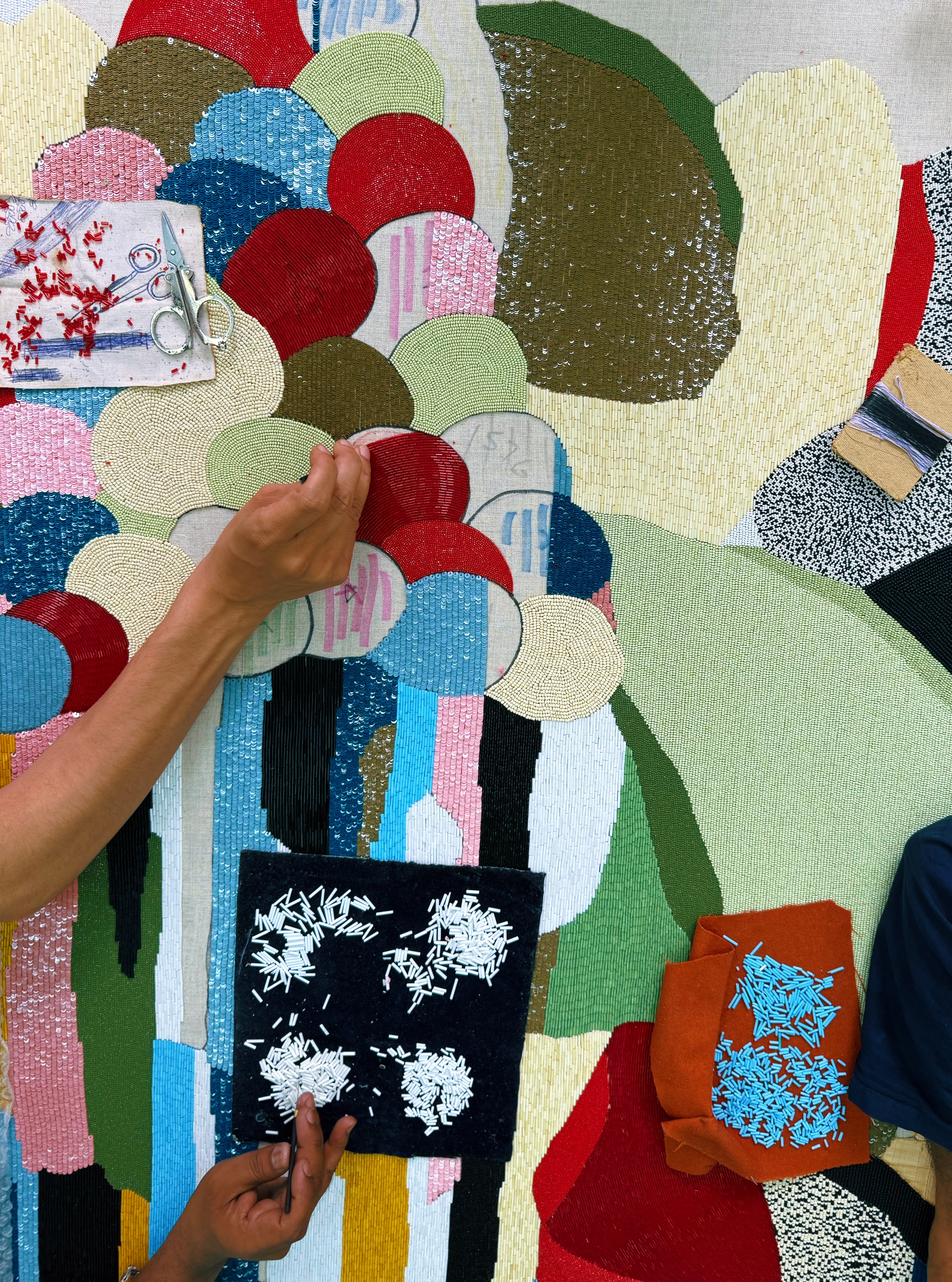 Mon procédé est le suivant : je réalise le dessin, je le photographie, je le projette sur le mur sur lequel j’installe une grande toile de lin. Je recopie ensuite un à un tous ses traits, pour savoir précisément ce que je veux garder, avant de le tendre sur un métier à tisser où tout sera brodé à la main. La plupart de ces pièces sont faites en perles de verre, qui les recouvrent comme une offrande, un bijou.