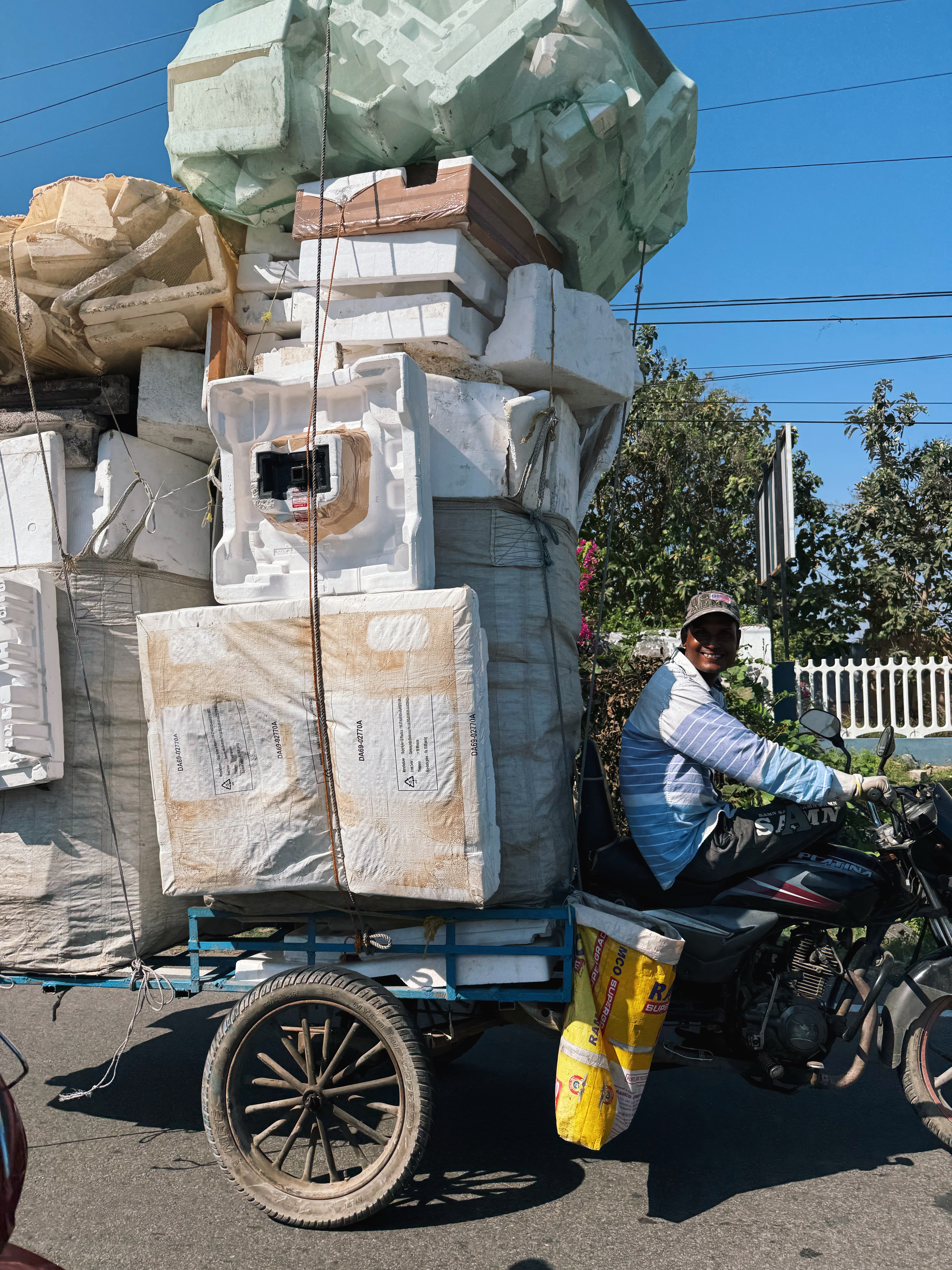 En Inde, tout est transformé. Le moindre truc qui ne sert pas à quelqu’un servira à quelqu’un d’autre. La moindre chute de matière sera réutilisée par une autre communauté qui en fera autre chose. Les vêtements ne sont jamais jetés, ils sont rapiécés, réutilisés en torchons, retransformés en fils, dans une dimension du cycle, mais pas liée à une dimension écologique. Il n’y a pas de dissociation des matériaux. Un bracelet en verre coûte beaucoup moins cher qu’un bracelet en plastique. Parce que le plastique ne casse pas, dure plus longtemps.