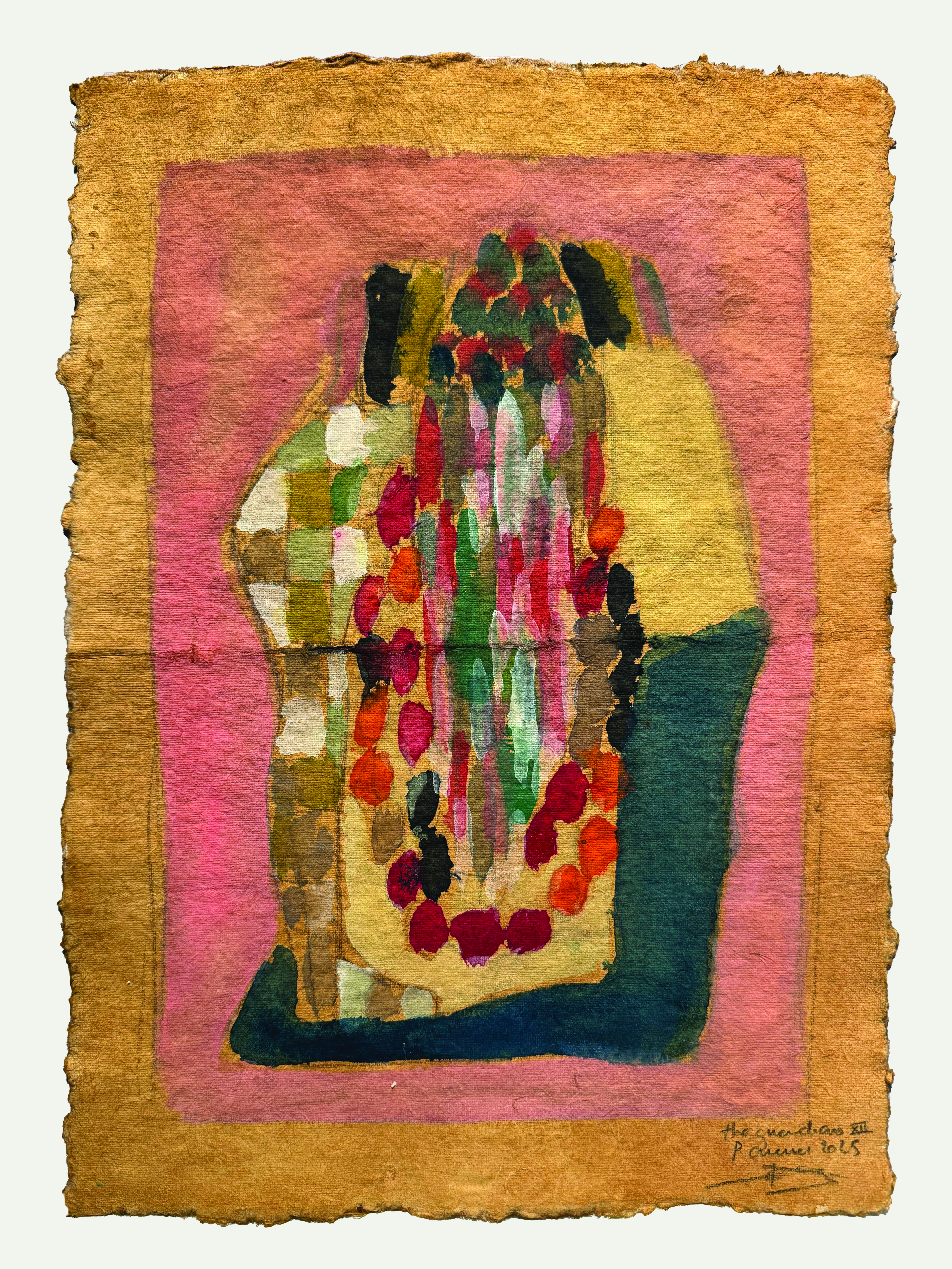 La Villa Swagatam est une occasion pour moi de développer un projet de recherche entamé il y a plusieurs années et qui s’intitule Les gardiens du monde. Au fur et à mesure de mes voyages, j’ai accumulé un répertoire de formes et de couleurs, archivées sous la forme de dessins, qui rassemble des rituels ancestraux au sein de différentes communautés, en Argentine, au Chili, au Bénin, au Maroc, au fin fond des Etats-Unis ou ici, en Inde. La particularité de ces rituels païens ou religieux est leur vocation d’accompagner le changement des saisons. Holi, la fête des couleurs, par exemple, que je suis allée faire à Varanasi, est une célébration hindoue qui accompagne le passage au printemps.