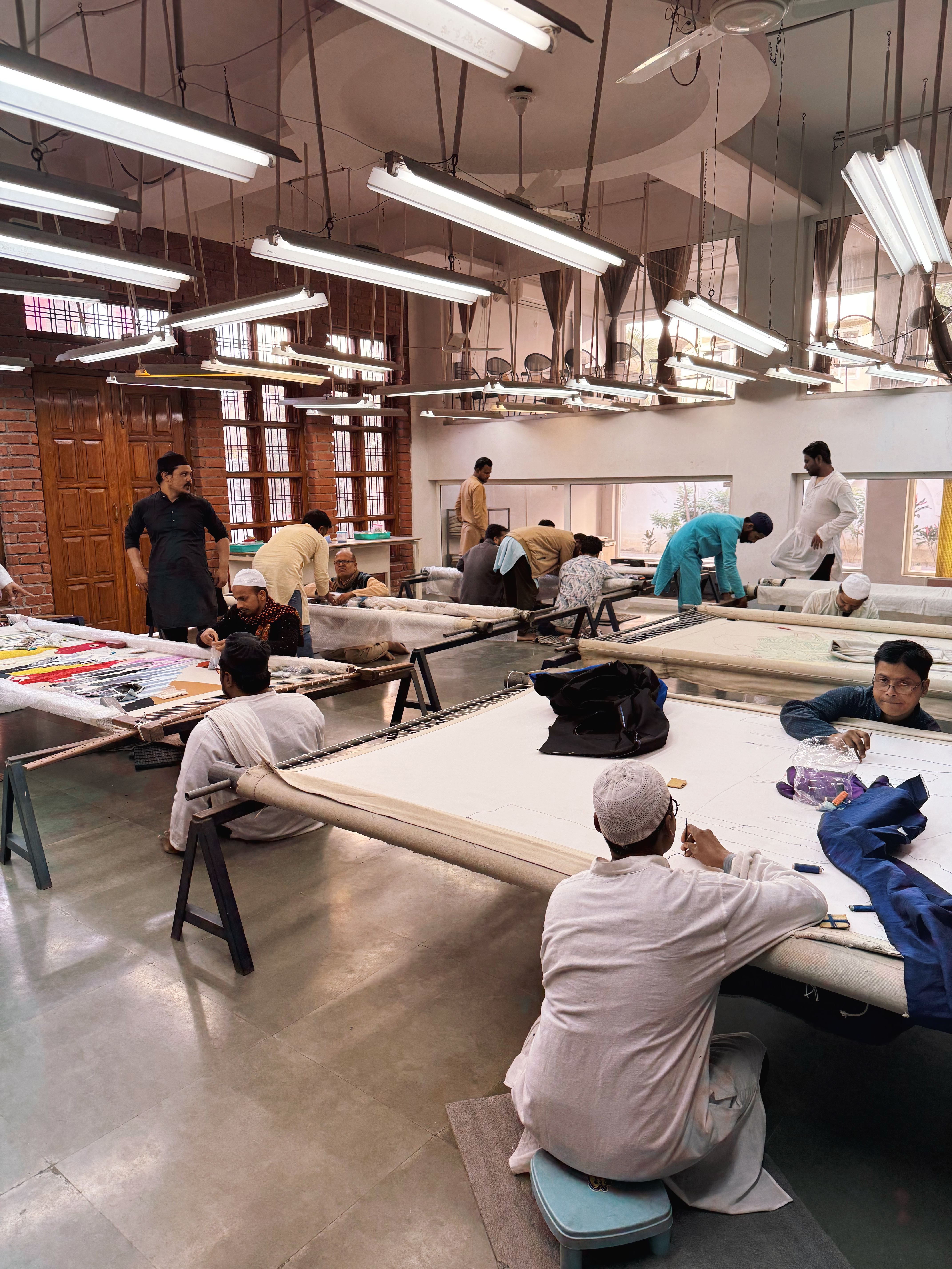 Bien que j’apprivoise de multiples techniques, pour ce projet, j’ai principalement travaillé la broderie. Je n’avais jamais été en Inde. J’ai pris une énorme claque en arrivant, en observant les brodeurs travailler cinq centimètres par cinq centimètres par jour, avec minutie et précision. Dans l’atelier où je suis à Lucknow, ils sont vingt-cinq à se concentrer exclusivement sur mon travail, par l’usage d’une technique née dans cette ville qui ne se transmet que par l’apprentissage et à l’oral.