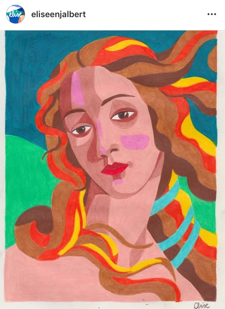 Elise, j’ai flashé. Tout d’abord parce qu’elle a repris mon tableau préféré : la Naissance de Vénus de Botticelli, et ensuite parce que son jeu de couleurs et de texture est unique. Ces ombres qui viennent donner une gravité à ses dessins, ces couleurs vives, tout est intensité, profondeur, assemblage. Les corps se mélangent, se superposent et s’affirment avec un vrai contraste qu’on pourrait qualifier de pop ! Bref, un peps visuel qui nous envoie comme une bouffée d’énergie.