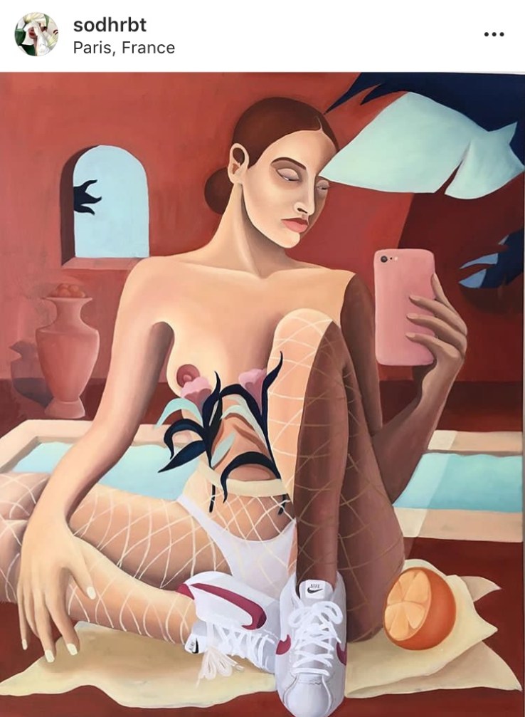 Rosalie est l’artiste que je suis depuis quelques années maintenant. J’ai tout de suite accroché à l’époque où elle faisait beaucoup de femmes à la peau noire, sur des fonds bleutés dégradés. Un peu comme Sophie, j’adore le mélange qu’on peut imaginer entre une déesse grecque et une Rihanna, entre un esprit Antique historique et un moderne qui en jette et qui vient nous réveiller un peu tout ça. Les femmes de Roso sont tout simplement badass, et ça donne envie de mettre sa plus grande paire de talon hauts et de montrer aux autres que ouais, on est bonne et que celui qui n’est pas d’accord avec ça peut aller se faire foutre.