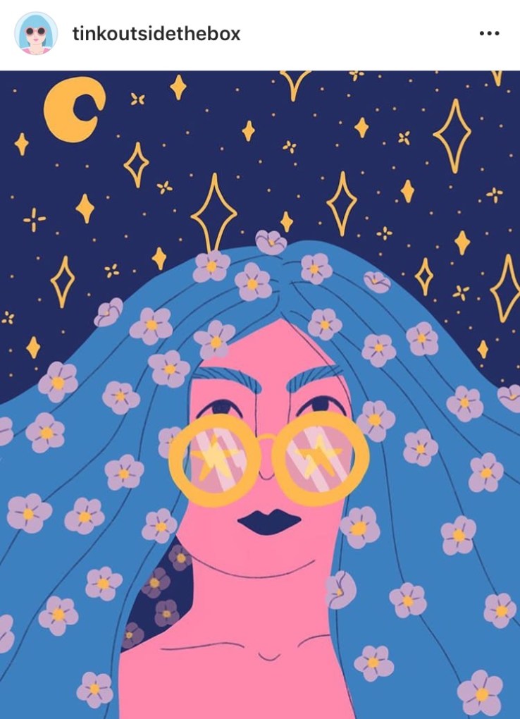 Certaines personnes considèrent que la musique qu’ils écouteront aura un impact sur leur humeur. Tink, c’est un peu mon Coldplay « Viva la Vida » à moi, ma Janis Joplin de l’illustration. La première phrase qu’on peut lire sur sa biographie instagram c’est « illustrating my vibrant mind », et c’est tout simplement vrai. Tink c’est le positif, la joie de vivre, la liberté, s’aimer et pouvoir faire ce qui nous plaît. Si vous en avez marre du temps gris et du vent froid, laissez-la vous emmener dans son Neverland où l’été ne finit jamais.