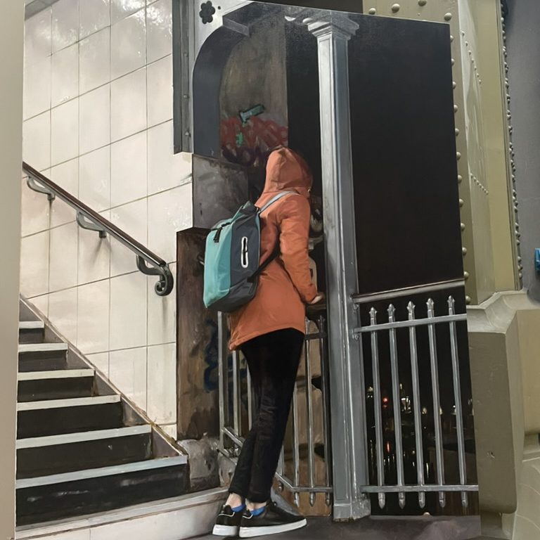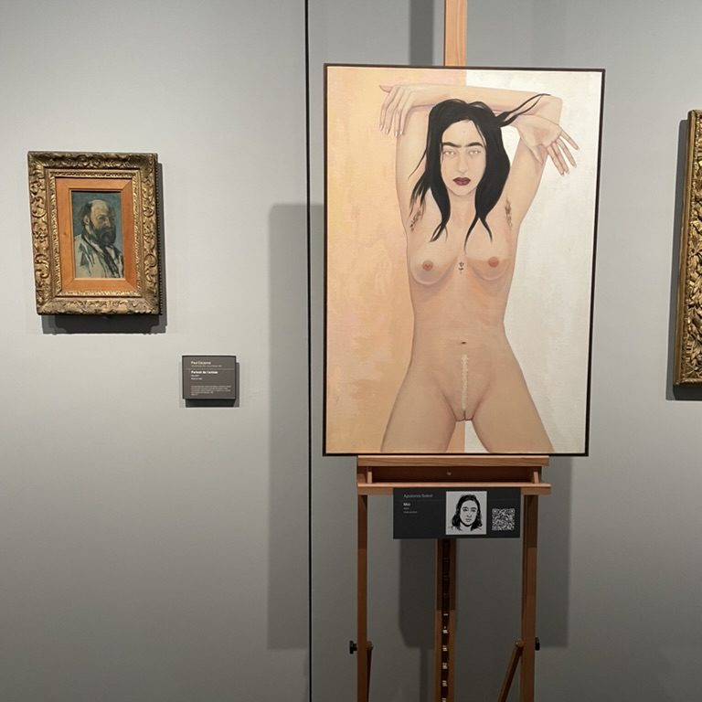 19 septembre 2024 – Format plus intime Inès Longevial dit d’ailleurs vous pouvez toucher la toile si vous voulez impression de Salon des Sélectionnés pas des Refusés même si ça en choquait certains les goûts les couleurs peu importe ce n’est même pas une question qu’on se pose parce que tout se mélange toutes les inspirations les époques les styles les formes les langues les corps comme ceux des artistes posant devant leur propre toile échangeant discutant avec le public à la fois très curieux bavard et timide parce que j’ai demandé à Jean-Baptiste Boyer ce n’est pas trop difficile pour vous intimidant tous ces gens qui vous questionnent sur vos toiles et il a dit Si bien sûr si je peins c’est que je n’arrive pas à mettre des mots toujours mais pour moi c’est pareil déranger un artiste c’est sacrilège comme quand j’ai peur de pousser la porte d’une galerie en somme c’est le bain de peinture on voudrait voir cela tous les jours bannir les foires les événements compliqués tout ce qui nous éloigne et repartir avec l’idée de ce dialogue créé peut-être vouloir devenir artiste nous-même sortir nos pinceaux et les poser nous aussi sur le sol de cette gare le plan c’est de venir avec une artiste Adrianna connaît les noms de tout le monde je ne connais personne mais je croise ami.e.s peintres galeristes connaissance aperçue plusieurs fois écrit une thèse sur Notre-Dame dans l’escalier collègue d’atelier d’une amie encore et elle et lui je voudrais les inviter dans ma résidence tu as osé leur poser une question ? Une seule : comment avez-vous choisi l’œuvre que vous présenteriez ici ? Oh j’ai pensé à Orsay, tout simplement. C’était le jour des peintres.