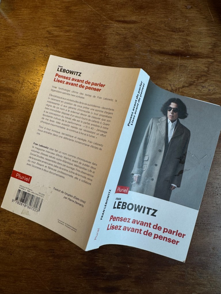 J’ai acheté Fran Lebowitz, Pensez avant de parler lisez avant de penser, en occasion chez Gibert (comme l’entièreté de mes achats de livres). Je fais un minuscule aparté pour le lecteur qui désirerait me connaître (si ce n’est pas déjà le cas, étant presque exclusivement lue par mes amies et amants), en lui disant que le débat de celui qui est arrivé en premier, de l’œuf ou de la poule, fait pâle figure face à celui qui questionne ma présence chez Gibert toutes les semaines pour acheter des livres, ou le prétexte d’acheter des livres uniquement pour me rendre chez Gibert. J’adore l’odeur de la colle des livres de poches.
