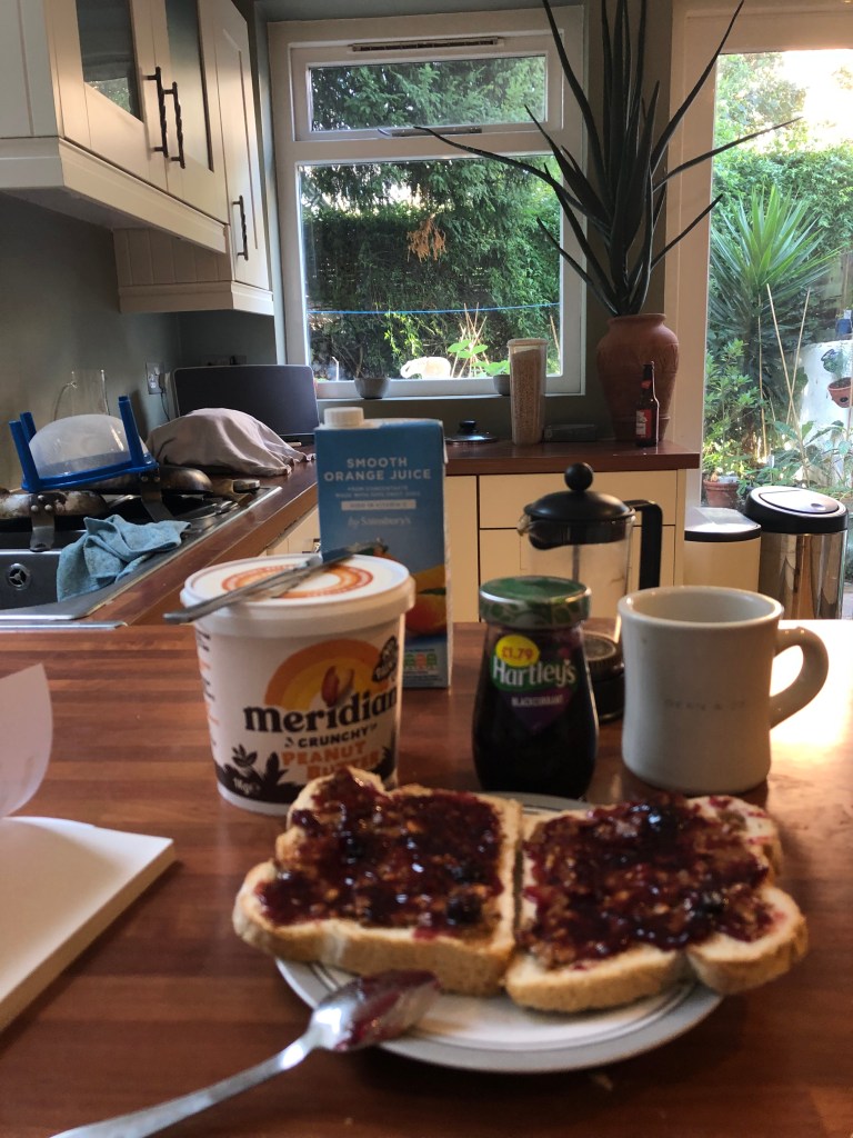 Ce matin j’ai une épiphanie en tartinant de la confiture de cassis et du beurre de cacahuète crunchy sur deux tranches de pain coupées en deux puis assemblées en sandwichs. Jeje m’apprend qu’on les appelle parfois des doorstops, leur épaisseur et surtout leur densité ayant le potentiel de maintenir certaines portes ouvertes. Cette recette ? Le surnom de cette recette ? Plus anglais, tu meurs. Pourtant, le goût de la mixture à la texture de gelée farineuse explose en bouche, croque. Je fais passer le tout avec une gorgée du café bon marché qui m’a brûlé la langue quelques minutes plus tôt.