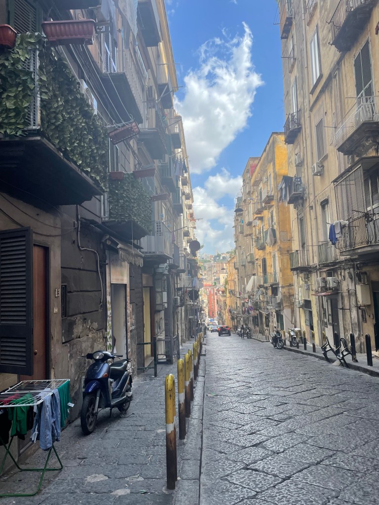 Il est temps de se mettre en route, de voir ce que Naples a dans le ventre. Nous saluons Vincenzo, que nous croiserons désormais tous les matins de notre séjour, chaque fois attablé aux côtés de personnes différentes et accueillant l’intégralité du quartier dans ce boudoir à ciel ouvert.