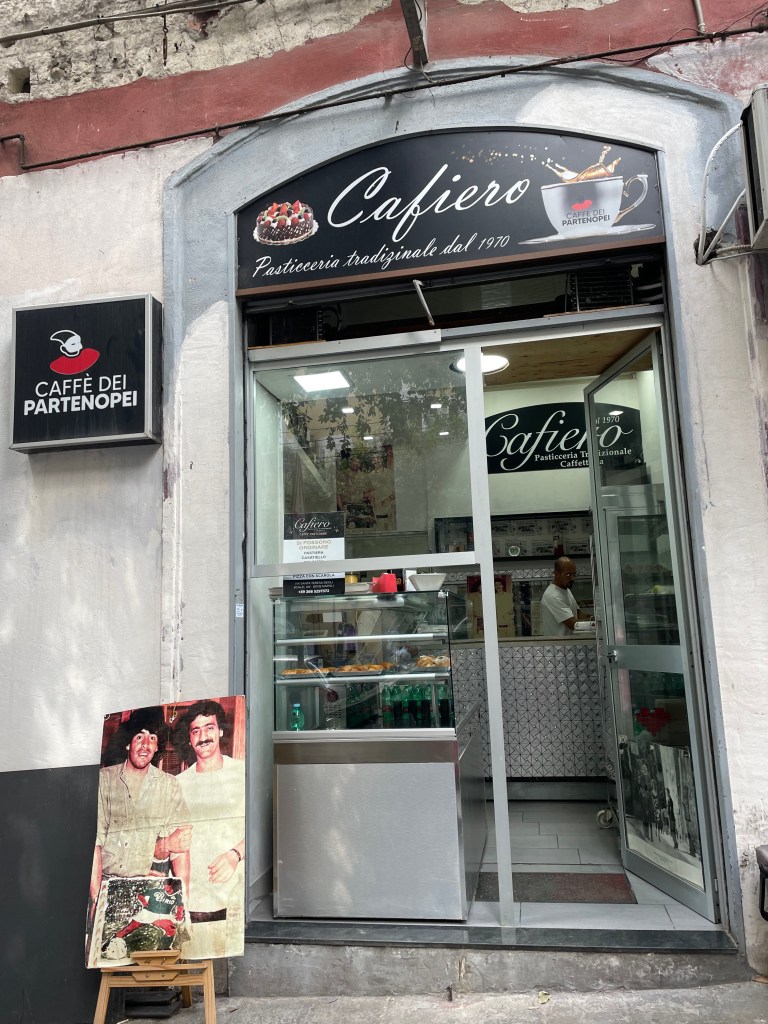 Nous descendons le corso Amedeo di Savoia jusqu’à Cafiero, une petite enseigne ne contenant qu’un comptoir et une grande table ronde en plastique posée sur le trottoir, entourée de chaises de jardin. J’ai faim. Je demande deux sfogliatelle et un café. Assises à table, le patron, un sec et fin moustachu grisonnant, inonde mes pâtisseries de sucre glace avant de s’installer avec nous. Il a décidé, lui aussi, de nous adresser la parole uniquement en italien. Cindy lui explique tant bien que mal que je viens d’arriver pour la semaine. La bouche pleine de pâte parfumée de zestes d’orange, je hoche la tête en souriant. Je remarque qu’il porte un t-shirt sur lequel est imprimé un article de journal mentionnant sa boutique. Quand il repart s’affairer, mon attention s’arrête enfin sur le chevalet disposé à l’entrée du café sur lequel se dresse une photo de lui, jeune, pendu au bras de Maradona, tous deux debout derrière une énorme masse sur lequel il l’a représenté, entièrement peint à la main. Cindy m’explique « c’est Vincenzo, on l’appelle le pâtissier de Maradona parce qu’un jour il lui a fait un gâteau qu’il a beaucoup apprécié, il en est très fier. » Je prends un troisième café. Plus tard, je retrouverai le peintre sur crème épaisse dans une vidéo où il raconte cette expérience magique en concluant par ces mots : souvenez-vous, les artistes ne meurent jamais.