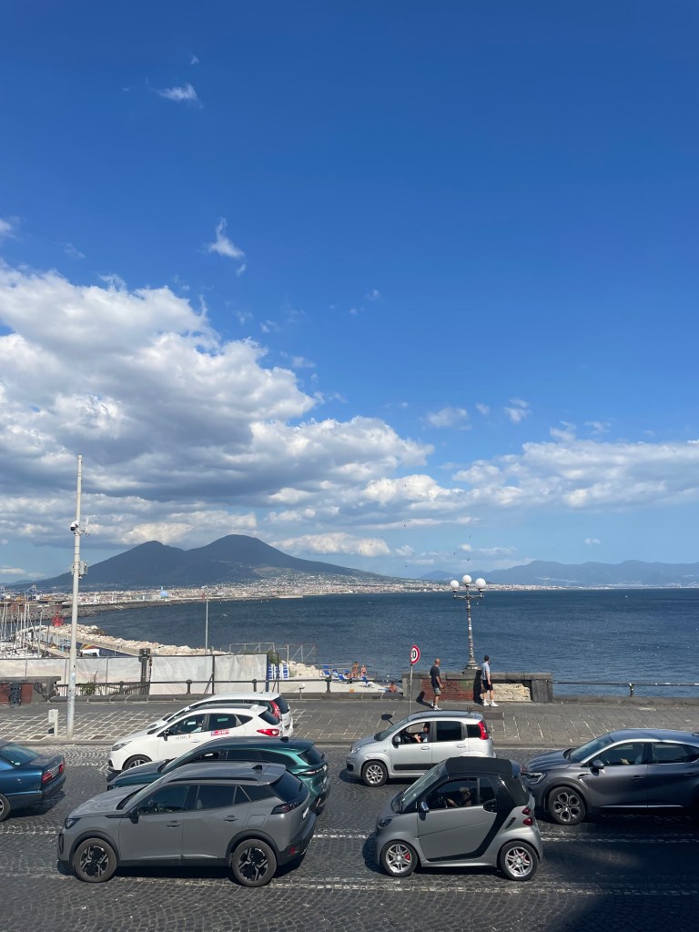 Rosario, mon jeune chauffeur de taxi, se retourne sur son siège pour mieux m’examiner. En plein milieu de la pétarade de bouchons qui forme les anneaux de la cité de Naples, il veut prendre le temps de constater à quoi ressemble cette écrivaine qui s’est jetée sur la plage arrière de son bolide comme sur un transat. Il semble satisfait de son évaluation parce qu’il conclut « Vous êtes une indépendante, comme moi. On se bat pour rester libre, le vrai problème, c’est les taxes. ». Il me pose pleins de questions, me demande ce que j’écris, d’où je viens, comment se porte le marché de l’emploi en France. Quand je lui demande s’il est napolitain, son visage se ferme. Ses yeux sombres ricochent dans le rétroviseur pour percer les miens avant de répondre « Je suis d’ici, oui. » Ses mains serrent le volant et il ne dit plus rien. Le jeu des questions lui-même est un enjeu de territoire. Pour détendre l’atmosphère, je le réconforte dans ma posture de touriste et lui demande quels sont, selon lui, les plus belles choses à voir ou à visiter. Il me trace un itinéraire que je note phonétiquement sur mon téléphone avant de terminer son énoncé d’une seule phrase : the most important, you enjoy Napoli and the people.